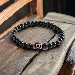 delikatna niezwykle ciekawa bransoletka- talizman wykonana z onyksu (kuleczki 6mm) oraz elementu z AGATU TYBETAŃSKIEGO (czerń + beż) AGAT TYBETAŃSKI - ma ponoć niezwykłe, ochronne właściwości chroni prz ...