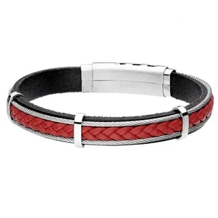 Męska bransoletka będąca niebanalnym i eleganckim dodatkiem. Wykonana jest z czarnej skóry naturalnej, czerwonego plecionego rzemienia oraz linek. Stalowa linka oraz pleciony rzemień nadają bransoletce niepowtarzalnego charakteru. Bransoletkę wyposażono w trwałe zapięcie, które pozwala na regulowanie długości. Kolor: czerwony Materiał: