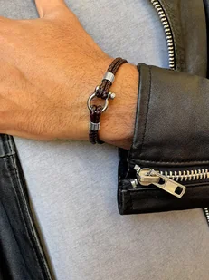 Bransoletka męska skórzana brązowa stal czarna 21cm