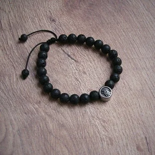 TUTAJ: prosta, lecz ciekawa bransoletka NA SOLIDNYM SZNURECZKU NYLONOWYM wykonana z kuleczek porowatej lawy wulkanicznej (8mm) oraz masywnej, dwustronnej przekładki z wizerunkiem WILKA, wykonanej w ...