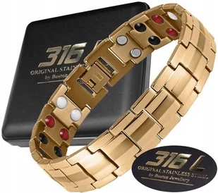 ZŁOTA ZDROWOTNA BRANSOLETA BRANSOLETKA MĘSKA MAGNETYCZNA MOCNA ORYGINAŁ BOSTON JEWELLERY® Przedstawiamy wysokiej jakości kolekcję biżuterii marki BOSTON JEWELLERY® ze stali chirurgicznej, tytanu oraz wolframu. Obecnie wyroby z tych szlachetnych metali są hitem na rynku !!! W tej ofercie prezentujemy wyjątkowo elegancki model męski bransolety magnetycznej, który wykonany jest z NAJWYŻSZEJ JAKOŚCI STALI CHIRURGICZNEJ 316L platerowanej 18k złotem. Model ten wyróżnia bardzo eleganckie połączenie elementów złotych i srebrnych. Taki układ bardzo efektownie się prezentuje na dłoni i robi niesamowite wrażenie !!! Jest to jeden z najciekawszych i najlepiej sprzedających się modeli w ostatnim czasie ! ✅ORYGINALNA BRANSOLETA BOSTON JEWELLERY® Z OFICJALNEJ DYSTRYBUCJI 2025 - AUTENTYCZNA WYSOKOGATUNKOWA STAL CHIRURGICZNA 316L I ZŁOCENIE 18K. PRODUKT KLASY PREMIUM ! W bransolecie zastosowano wyjątkowe połączenie 4 technologii - oprócz magnesów neodymowych , które mają bardzo korzystny wpływ na organizm człowieka, umieszczono tutaj wstawki bioceramiczne FIR, NEGATIVE ION oraz GERMANIUM.