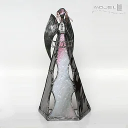 Stojący anioł ze śliwkowego przejrzystego oraz szaroróżowego gęstegoszkła witrażowego z fakturą, oprawiony witrażową techniką Tiffany zużyciem miedzi i cyny - patynowany i przecierany. Jego główkę zrobiłammetodą fusingu (wypalanie szkła w temp. min. 800 stopni), skrzydła są zmiedzianej blachy - również cynowanej i patynowanej. Podstawka zbezbarwnego szkła. Anioł trzyma koszyczek, do którego można włożyć świeczkę-podgrzewacz i wtedy anioł zamienia się w świecznik. . . Wysokość anioła: