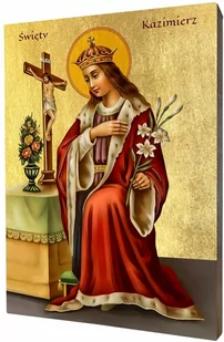 Ikona religijna święty Kazimierz Jagiellończyk Ikona religijna świętego Kazimierza Jagiellończyka wykonana na desce lipowej, podwójnie gruntowanej oraz uszlachetnionej płatkami pozłoty. Wizerunek świętego Kazimierza Jagiellończyka został naniesiony przy użyciu specjalnej techniki druku bezpośrednio na deskę. Kazimierz Jagiellończyk - polski królewicz, syn Kazimierza IV Jagiellończyka i Elżbiety Rakuszanki, od 1481 namiestnik królewski w Koronie Królestwa Polskiego; święty Kościoła katolickiego, patron Polski i Litwy. Ikona z tyłu posiada certyfikat naszej firmy wraz z rokiem produkcji oraz zawieszkę typu krokodyl i jest gotowa do zawieszenia; dostępna jest w pięciu rozmiarach; grafika dostosowywana jest do formatu deski przez co może nieznacznie różnić się od zdjęcia produktu: 10x15 cm 15x20 cm 20x25 cm 30x40 cm 40x50 cm Nie stosujemy produkcji masowej.