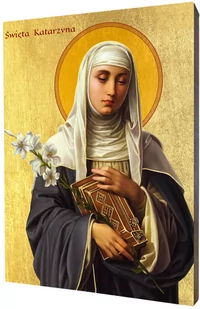 Ikona święta Katarzyna ze Sieny Ikona z wizerunkiem św. Katarzyny ze Sieny wykonana na desce lipowej, podwójnie gruntowanej oraz uszlachetnionej płatkami pozłoty. Wizerunek św. Katarzyny ze Sieny został naniesiony przy użyciu specjalnej techniki druku bezpośrednio na deskę. Św. Katarzyna ze Sieny Swięta Katarzyna Sieneńska- prosta ale nieprzeciętna kobieta, niewykształcona, ale zarazem mądra, drobna i delikatna, a jakże silna i apodyktyczna.
