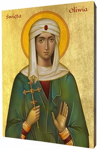Ikona święta Oliwia Ikona świętej Oliwii wykonana na desce lipowej, podwójnie gruntowanej oraz uszlachetnionej płatkami pozłoty. Wizerunek świętej Oliwii został naniesiony przy użyciu specjalnej techniki druku bezpośrednio na deskę. Ikona z tyłu posiada certyfikat naszej firmy wraz z rokiem produkcji oraz zawieszkę i jest gotowa do zawieszenia; dostępna jest w pięciu rozmiarach; grafika dostosowywana jest do formatu deski przez co może nieznacznie różnić się od zdjęcia produktu: 10x15 cm 15x20 cm 20x25 cm 30x40 cm 40x50 cm Ikony religijne ART CHRISTIANA - wspaniały upominek religijny Nie stosujemy produkcji masowej. Ikony powstają w chwili złożenia zamówienia, a każdego Klienta traktujemy indywidualnie.