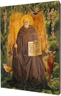 Ikona święty Jan Gwalbert Ikona świętego Jana Gwalberta wykonana na desce lipowej, podwójnie gruntowanej oraz uszlachetnionej płatkami pozłoty. Wizerunek świętego Jana Gwalberta został naniesiony przy użyciu specjalnej techniki druku bezpośrednio na deskę. Święty Jan Gwalbert-patron leśników Urodził się w 995 r. (wg innej wersji w 1000 r.) w arystokratycznej rodzinie we Florencji. Podczas wojny między miastami został zabity jego brat Ugo.