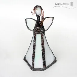 Stojący anioł ze szkławitrażowego - białego półgęstego i białego z opalizującą tęczowopowłoką. Oprawiony witrażową techniką Tiffany z użyciem miedzi i cyny -patynowany i przecierany. Jego główkę zrobiłam metodą fusingu (wypalanieszkła w temp. min. 800 stopni). Skrzydła są z przejrzystego iryzującegoszkła. Podstawka z bezbarwnego szkła.