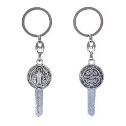 Brelok - klucz - Św. Benedykt Brelok o kształcie klucza z medalionem Świętego Benedykta. Breloczek Benedykta wykonany jest całkowicie z metalu w kolorze srebrnym. Św. Benedykt przyczynił się do powstania Europy osadzonej na wartościach chrześcijańskich. Długość samego klucza: