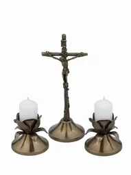 Komplet kolędowy metalowy Komplet kolędowy wykonany z metalu, patynowany. Zestaw kolędowy zapakowany w eleganckie praktyczne pudełko z szybką z plexi. Wysokość krzyża kolędowego: 19,5 cm, szerokość: 8 cm Wysokość świecznika: