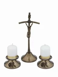 Komplet kolędowy papieski metalowy Komplet kolędowy papieski wykonany z metalu patynowany. Zestaw zapakowany w eleganckie praktyczne pudełko z szybką z plexi. Wysokość krzyża kolędowego: 22 cm, szerokość: 8,5 cm Wysokość świecznika: