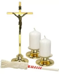 Komplet kolędowy benedyktyński Komplet kolędowy z metalu w kolorze złotym. Solidny zestaw z odlewanych części. Zestaw polerowany na połysk. Zestaw kolędowy zapakowany w eleganckie praktyczne pudełko z szybką z plexi. Wysokość krzyża kolędowego: