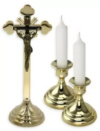 Komplet kolędowy ostatnia wieczerza Komplet kolędowy z metalu w kolorze stary mosiądz. Solidny zestaw z odlewanych części. Zestaw polerowany na połysk. Zestaw kolędowy zapakowany w eleganckie praktyczne pudełko z szybką z plexi. Wysokość krzyża kolędowego: