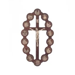 Krzyż drewniany, droga krzyżowa Okazały krzyż z drewna bukowego do zawieszenia na ścianę. Pan Jezus na krzyżu, a po okręgu 14 stacji z drogi krzyżowej Jezusa. Krzyż w dwóch wersjach kolorystycznych: naturalny (jasny) i beicowany ciemny. Krzyż zabezpieczony jest lakierem bezbarwnym.