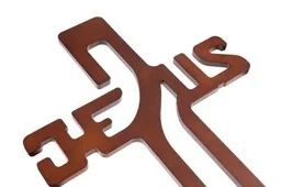 Krzyż drewniany z napisem Jezus Proszę o nie wybieranie wysyłki tego krzyża paczkomatem ( nie mieści się ). Krzyż wykonany z drewna klejonego (sklejka). Powierzchnia zabezpieczona brązową bejcą i malowana lakierem bezbarwnym. Swoim kształtem krzyż tworzy słowo Jezus. Na plecach krzyża zamontowano haczyk umożliwiający jego zawieszenie.