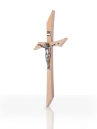 Krzyż z drewna bukowego smukły Krzyż bukowy wykonany z jednego fragmentu. Krzyż z Panem Jezusem w kolorze srebrnym. Całość zabezpieczona lakierem bezbarwnym. Na plecach krzyża znajduje się otwór do zawieszenia na ścianę. Krzyż dostępny w dwóch wariantach- jasny, ciemny i w czterech wysokościach: