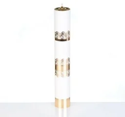 Świeca na wkład olejowy biała bez regulacji 40 cm Świeca Liturgiczna - Doskonała Imitacja Prawdziwej Parafiny Białe Perfekcjonizm Świeca liturgiczna w kolorze białym to perfekcyjne połączenie estetyki i funkcjonalności. Wykonana z bardzo trwałego tworzywa, doskonale imituje prawdziwą parafinę, nadając wnętrzu sakralnemu wyjątkowego uroku. Zdobienia Ażurowe - Złoty Blask Ażurowe zdobienia w kolorze złotym to wyrafinowany detal, który nadaje świecy liturgicznej elegancki charakter. Precyzyjne wzory sprawiają, że jest ona nie tylko źródłem światła, ale także pięknem wizualnym w czasie liturgii. Solidność w Detalu - Mosiężny Talerzyk i Chwyt Knota Talerzyk oraz chwyt knota wkładu wykonane są z mosiądzu, co dodaje solidności i trwałości konstrukcji.