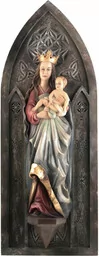 Jeśli jesteś miłośnikiem architektury europejskiej to ta rzeźba Najświętszej Marii Panny i Dzieciątka Jezus w stylu gotyckim jest doskonałym uzupełnieniem Twojej listy przychylnych dzieł sztuki. Ręcznie wykonany w każdym szczególe, ten piękny wizerunek Świętej Marii i Dzieciątka Jezus na tle gotyckiego okna może być używany wszędzie - w kościele lub w domu. Jest on dostępny do natychmiastowego zakupu!Wymiary: (80cm x 30cm x 10cm)Materiał: drewno lipowe