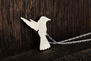 Delikatny naszyjnik z zawieszką w kształcie koliberka na łańcuszku. Elementy ręcznie wycinam z alpaki (rodzaj mosiądzu), następnie poleruję i matowię. Łańcuszek posrebrzany. Wielkość kolibra ok. 2 cm, długość ...