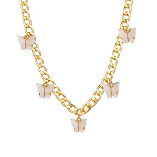 Cechy produktu Naszyjnik łańcuch Z ozdobnymi zawieszkami w postaci motyli Kolor złoty, srebrny Regulowane zapięcie Materiał: stal