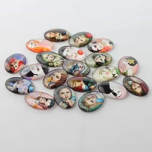 Opis: Kaboszon szklany z obrazkiem Materiał: Szkło Ilość sztuk w opakowaniu: Jedna, losowo wybrana Wymiary: Długość: 25mm Szerokość: 18mm Grubość: 6mm