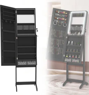 Przechowywanie biżuterii z haczykami, uchwytami, przegródkamiWymiary: 152 x 39,5 x 36,5 cm (wys. x szer. x gł.)Konstrukcja stojaka z dwiema solidnymi nóżkamiZabezpieczenie: zamykane drzwiczkiZakres dostawy: 1x szafka na kosmetyki i biżuterię z lustrem2x klucze1x wielojęzyczna instrukcja obsługi1x zestaw akcesoriów do montażu
