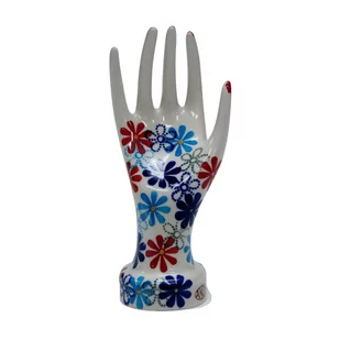 Ceramiczny stojak na biżuterię duży, w kształcie powabnej, damskiej dłoni ozdobionymi podszkliwnymi wzorami – niczym przyodziany w wyjątkowo śliczną rękawiczkę, to oryginalny i nieoceniony wieszak dla kobiecych świecidełek. Rewelacyjnie wyglądający dodatek dekoracyjny a zarazem funkcjonalny kobiecej toaletki jak i łazienki. Dzięki szkliwieniu, jest bardzo łatwy w utrzymaniu czystości. Zawieszona na nim biżuteria taka jak, łańcuszki, kolczyki czy pierścionki będą zawsze pod ręką, ułożone w piękny sposób. Zarówno złota, srebrna czy platynowa biżuteria będzie prezentować się wyjątkowo na naszej ceramice bolesławieckiej.