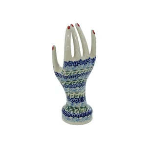 Ceramiczny stojak na biżuterię mały, w kształcie powabnej, damskiej dłoni ozdobionymi podszkliwnymi wzorami, prosto z Bolesławca – niczym przyodziany w wyjątkowo śliczną rękawiczkę, to oryginalny i nieoceniony wieszak dla kobiecych świecidełek. Rewelacyjnie wyglądający dodatek dekoracyjny a zarazem funkcjonalny kobiecej toaletki jak i łazienki, taki który pozwoli na zaprzestanie gubienia biżuterii w całym domu! Ahhh… skąd my to znamy! Dzięki szkliwieniu, jest bardzo łatwy w utrzymaniu czystości. Zawieszona na nim biżuteria taka jak, łańcuszki, kolczyki czy pierścionki będą zawsze pod ręką, ułożone w piękny sposób. Zarówno złota, srebrna czy platynowa biżuteria będzie prezentować się wyjątkowo na naszej ceramice bolesławieckiej. Szukasz pomysłu na prezent z okazji Dnia Matki, Dnia Kobiet lub innych uroczystości choćby dodatku do pierścionka zaręczynowego czy wieszaka na obrączki? Strzał w dziesiątkę!