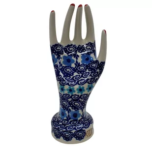 Ceramiczny stojak na biżuterię mały, w kształcie powabnej, damskiej dłoni ozdobionymi podszkliwnymi wzorami, prosto z Bolesławca – niczym przyodziany w wyjątkowo śliczną rękawiczkę, to oryginalny i nieoceniony wieszak dla kobiecych świecidełek. Rewelacyjnie wyglądający dodatek dekoracyjny a zarazem funkcjonalny kobiecej toaletki jak i łazienki, taki który pozwoli na zaprzestanie gubienia biżuterii w całym domu! Ahhh… skąd my to znamy! Dzięki szkliwieniu, jest bardzo łatwy w utrzymaniu czystości. Zawieszona na nim biżuteria taka jak, łańcuszki, kolczyki czy pierścionki będą zawsze pod ręką, ułożone w piękny sposób. Zarówno złota, srebrna czy platynowa biżuteria będzie prezentować się wyjątkowo na naszej ceramice bolesławieckiej. Szukasz pomysłu na prezent z okazji Dnia Matki, Dnia Kobiet lub innych uroczystości choćby dodatku do pierścionka zaręczynowego czy wieszaka na obrączki? Strzał w dziesiątkę!