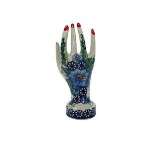 Ceramiczny stojak na biżuterię mały, w kształcie powabnej, damskiej dłoni ozdobionymi podszkliwnymi wzorami, prosto z Bolesławca – niczym przyodziany w wyjątkowo śliczną rękawiczkę, to oryginalny i nieoceniony wieszak dla kobiecych świecidełek. Rewelacyjnie wyglądający dodatek dekoracyjny a zarazem funkcjonalny kobiecej toaletki jak i łazienki, taki który pozwoli na zaprzestanie gubienia biżuterii w całym domu! Ahhh… skąd my to znamy! Dzięki szkliwieniu, jest bardzo łatwy w utrzymaniu czystości. Zawieszona na nim biżuteria taka jak, łańcuszki, kolczyki czy pierścionki będą zawsze pod ręką, ułożone w piękny sposób. Zarówno złota, srebrna czy platynowa biżuteria będzie prezentować się wyjątkowo na naszej ceramice bolesławieckiej. Szukasz pomysłu na prezent z okazji Dnia Matki, Dnia Kobiet lub innych uroczystości choćby dodatku do pierścionka zaręczynowego czy wieszaka na obrączki? Strzał w dziesiątkę!