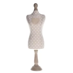 Manekin stojak na biżuterię beżowy kropki 46 cm Manekin stojak na biżuterię dekoracyjny w kolorze beżowym w białe kropki z naszytym serduszkiem. Dekoracja i ozdoba do wystroju wnętrza. Manekin może posłużyć jako samodzielna dekoracja lub stojak na biżuterię. Podstawa manekina wykonana z drewna w kolorze beżowym, korpus tworzywo naciągnięte materiałem. Piękny dodatek w beżowym koloru.