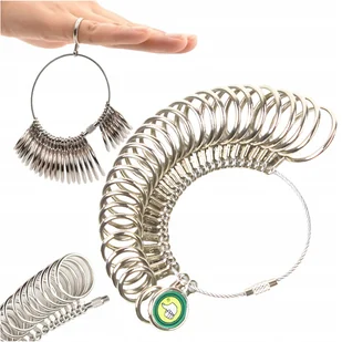 MIARKA JUBILERSKA MULTISIZER DO MIERZENIA PALCÓW OBRĄCZEK ZESTAW MIERNIKÓW NARZĘDZIE DO POMIARU MIERNIK MIARA OBRĄCZEK BIŻUTERII MIARA JUBILERSKA MULTISIZER ✅Miarka jubilerska to profesjonalny zestaw do dokładnego mierzenia rozmiarów palców i obrączek. Każdy pierścień w zestawie jest wyraźnie oznaczony rozmiarem, co pozwala na szybki i łatwy odczyt. To niezbędny przyrząd zarówno dla jubilerów, jak i osób planujących zakup pierścionka lub obrączki przez internet. Solidne wykonanie i wygodna forma sprawiają, że zestaw mierników jest praktyczny, estetyczny i niezawodny.