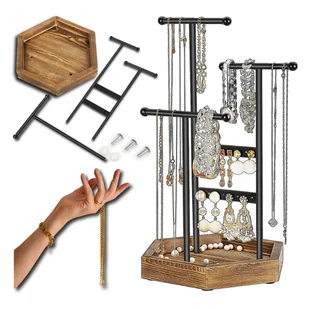 ORGANIZER na biżuterię STOJAK NA BIŻUTERIĘ EKSPOZYCJA BIŻUTERII szafeczka IDEALNY DLA CIEBIE! ✅Stylowy i elegancki stojak na biżuterię pasuje do nowoczesnego wystroju domu, wystaw sklepowych lub salonów i pozwala na natychmiastowe odnalezienie właściwych przedmiotów ✅Wyjątkowe wzornictwo sprawia, że ten stojak na biżuterię jest pięknym dodatkiem do toaletki. ✅Stojak na biżuterię ma sześciokątną podstawę, dzięki czemu można kupić kilka sztuk i łączyć je w różne kształty. UPORZĄDKUJ SWOJĄ BIŻUTERIĘ ☀️Dzięki 16 otworom, 3 pałeczkom w kształcie litery T o różnych wysokościach i drewnianej podstawie możesz zawsze uporządkować kolczyki, pierścionki, bransoletki, naszyjniki i długie naszyjniki. WYSOKA JAKOŚĆ WYKONANIA ◉Drewniana podstawa zapewnia większą stabilność; pręty mocowane są za pomocą śrub i gumowych uszczelek, dzięki czemu nie przechylają się ani nie przewrócą się.