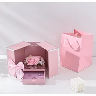 Wyjątkowe pudełeczko na biżuterię Pudełeczko idealne na prezent oraz jako niepowtarzalna oprawa dla biżuterii.Pod przeźroczystą osłonką znajduje się 9 czerwonych różyczek. Pudełeczko posiada wysuwaną szufladkę na naszyjnik lub bransoletkę. Wymiary pudełeczka:18 x 14 x 14 cm Pudełeczko zapakowane w elegancką torebkę w tym samym kolorze.