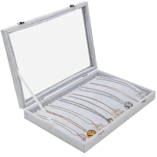 Pudełko na biżuterię z 20 haczykami i zamykanymi szklanymi pokrywkami, składane, szare aksamitne pudełko na biżuterię do przechowywania naszyjników,..