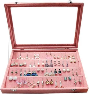 Pudełko na kolczyki z aksamitną przezroczystą pokrywką, organizer, ekspozytor, witryna na biżuterię, 32 pary kolczyków, zamykane, brzoskwiniowe