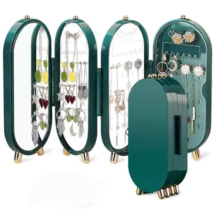 Opis Stojak na biżuterię Organizer na kolczyki z lusterkiem i 4 drzwiczkami Składany ekran do wieszania naszyjników dla kobiet Kolor: Zielony Kształt Owalny ...