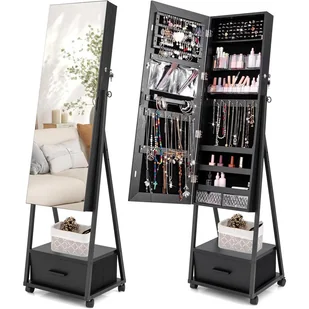 Szafka na biżuterię z lustrem 2 w 1: Ta szafka na biżuterię jest nie tylko idealnym miejscem do przechowywania kosmetyków, ale także praktycznym lustrem. Lustro o pełnej długości zapewnia szerokie pole widzenia, dzięki czemu podczas ubierania się można obejrzeć się od stóp do głów.