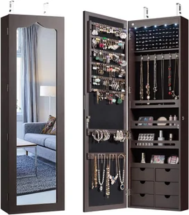 Flanela w szafce może zapobiec zarysowaniu biżuterii. Ponadto, po otwarciu szafki na biżuterię, diody LED w szafce zaświecą się, aby pomóc Ci znaleźć biżuterię. Ponadto organizer na biżuterię jest wyposażony w duże lustro, dzięki czemu można wyraźnie zobaczyć połączony efekt biżuterii i ubrań. Cechy: Wszechstronna przestrzeń do przechowywania zapewnia dużo miejsca do wykorzystaniaMożliwość montażu na drzwiach lub ścianie, aby spełnić Twoje wymaganiaTylny haczyk do zawieszenia na drzwiach oferuje czterostopniową regulację wysokościLustro w drzwiach szafy do sprawdzania ubrań i makijażuOświetlenie LED otwartych drzwi zapewnia dobrą widoczność przez cały czasZamykana konstrukcja zapewnia bezpieczeństwo biżuterii przez cały czasWysokiej jakości płyta MDF sprawia, że szafka na biżuterię jest mocniejsza i trwalszaFlanelowa wyściółka chroni biżuterię przed zużyciemElegancki i stylowy wygląd, który uzupełni Twój pokójInformacje o produkcie: Kolor: brązowyMateriał: