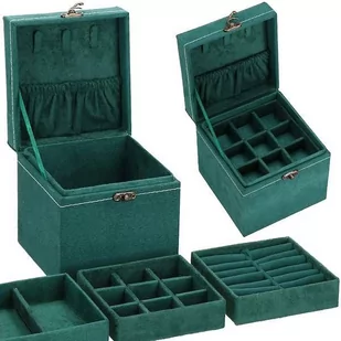 Marka: SpringosKolor: butelkowa zieleńKolor okuć: stare złotoTkanina zewnętrzna i wewnętrzna: welurRozmiar zamkniętej szkatułki: ok. 12x12x12 cm