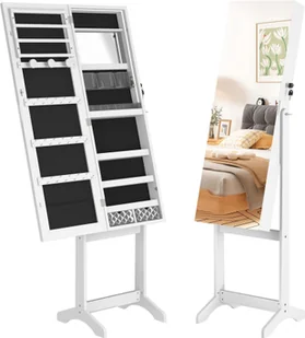 Przechowywanie biżuterii z haczykami, uchwytami, przegródkamiWymiary: 152 x 39,5 x 36,5 cm (wys. x szer. x gł.)Konstrukcja stojaka z dwiema solidnymi nóżkamiZabezpieczenie: zamykane drzwiczkiZakres dostawy: 1x szafka na kosmetyki i biżuterię z lustrem2x klucze1x wielojęzyczna instrukcja obsługi1x zestaw akcesoriów do montażu