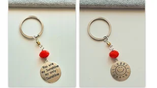 BRELOK BRELOCZEK DO KLUCZY BLASZKA SŁOŃCE NAPIS POMARAŃCZOWY BRELOK Z BLASZKĄ W ZESTAWIE JEST KÓŁKO DO KLUCZY W KOLORZE SREBRNYM UŻYTE DODATKI : DWUSTRONNA B...