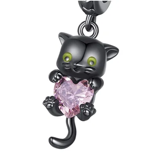 925 przedstawiający czarnego kotka trzymającego serce wykonane z różowej cyrkoni najwyższej jakości. Idealnie pasuje do bransoletek modułowych typu Pandora lub innych marek, ale także jako zawieszka do naszyjnika. Świetnie nada się jako prezent!