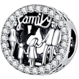 Cechy produktu: Materiał: Miedź powlekana srebrem techniką amélioré Wysokość: 12 mm Szerokość: 11 mm Waga: 1,7 g Piękna posrebrzana zawieszka, charms przedstawiający rodzinę, uzupełniony o białe cyrkonie, które będą pięknie mienić się na każdej dłoni.