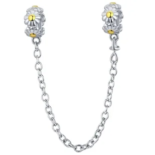 Charms Zabezpieczenie Stokrotki — łańcuszek w rytmie natury Charms Zabezpieczenie Stokrotki to delikatna, a zarazem praktyczna ozdoba, która wnosi do biżuterii powiew wiosennej świeżości. Zdobiony uroczymi stokrotkami z żółtymi środkami i srebrzystymi płatkami, przywołuje na myśl beztroskie chwile na łące, radość z prostych rzeczy i siłę płynącą z natury. Dwie zdobione końcówki połączone lekkim, solidnym łańcuszkiem nie tylko chronią bransoletkę przed rozpięciem, ale również tworzą subtelną ramę dla całej kompozycji charmsów, wnosząc do niej spójność i lekkość. Kwiatowy akcent do bransoletki Pandora Ten charms zabezpieczający kompatybilny z Pandora świetnie uzupełnia kompozycje inspirowane florą, kobiecością i harmonią z naturą. Idealny dla osób, które kochają stylizacje z nutą romantyzmu i przywiązują wagę do detali.