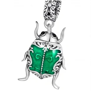 Magia detalu zaklęta w naturze Zawieszka w kształcie żuka została zaprojektowana z niezwykłą precyzją. Jego wypukłe, zielone skrzydełka delikatnie połyskują, tworząc wrażenie ruchu i życia, jakby owad zaraz miał wzbić się w powietrze. Korpus i głowa zostały starannie wyrzeźbione w srebrze, z widocznymi wypustkami i delikatnym połyskiem. Najbardziej zachwycają jednak roślinne ornamenty, które oplatają żuka, tworząc finezyjną kompozycję w stylu vintage. To połączenie natury i sztuki jubilerskiej nadaje charmsowi unikatowego charakteru, który wyróżnia się na tle klasycznych zawieszek.