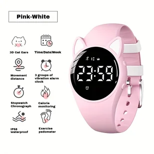 TEMU Urocze zegarki dla nastolatków w kształcie kocich uszu | Pasek ABS, obudowa z żywicy, inteligentny mechanizm, stoper, data i czas, krokomierz,