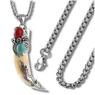 Męski naszyjnik z zębem wilka ze stali nierdzewnejMateriał: Wysokiej jakości stal szlachetna Długość łańcuszka: 60 cmWymiary wisiorka: 2 cm x 2,5 cmMotyw: Ząb wilka z czerwonym i turkusowym kamieniemKolor: