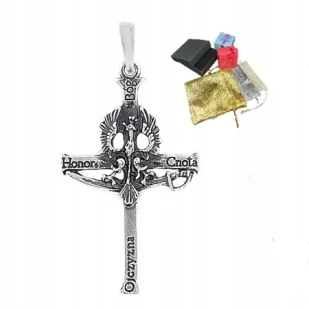 Srebrny krzyżyk patriotyczny z orłem i napisem „Bóg, Honor, Cnota, Ojczyzna#8221; – srebro próby 925Wyjątkowy srebrny krzyżyk patriotyczny wykonany z najwyższej jakości srebra próby 925 to symbol wiary, odwagi i miłości do Ojczyzny.Łączy w sobie głęboki przekaz religijny z duchem patriotyzmu, tworząc niepowtarzalny znak przywiązania do tradycji, wartości i historii Polski.Centralnym elementem krzyża jest wizerunek orła – odwieczny symbol wolności, dumy i siły narodu polskiego.Tuż pod nim znajduje się szpada, która przywodzi na myśl odwagę i gotowość do obrony wiary oraz Ojczyzny.Na ramionach krzyża umieszczono słowa:nbsp;„Bóg, Honor, Cnota, Ojczyzna#8221; – hasła, które od pokoleń stanowią fundament polskiej tożsamości i moralności.Parametry: