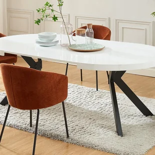 Stół do jadalni KOMONI dla 4 do 8 osób wyposażony jest w rozkładany blat z MDF oraz eleganckie, stalowe nogi. Zaokrąglony kształt stołu idealnie wpisze się w każde wnętrze, wnosząc do niego odrobinę przytulności.