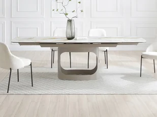 Rozkładany stół jadalniany DAVULO łączy ceramiczny blat z hartowanym szkłem oraz graficzną metalową podstawę, tworząc solidną konstrukcję zaprojektowaną z myślą o trwałości. Wybór tych materiałów zapewnia również łatwość codziennego czyszczenia.